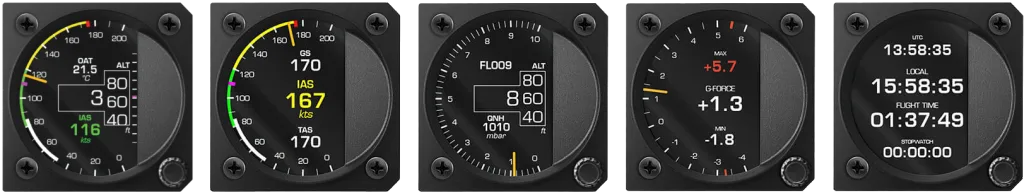 | All-in-one | Airspeed Indicator | Altimeter | G-force | Chrono | |